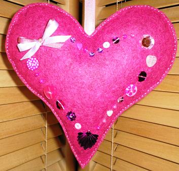 This bright pink softly padded hanging heart measures approximately 17 cm x 17 cm and is decorated with sequins, beads, buttons and ribbon. I think I will put it on sale at Crafter’s Corner at Traders, Littlehampton for £6.50 – do you think it might be a good seller and it’s worth me making another one?